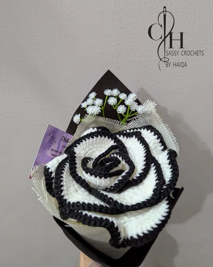 This handmade black & white crochet rose bouquet is a perfect symbol of balance — representing grace and depth in a unique way. Crafted with soft, high-quality yarn, the flower’s bold monochrome shades give it a premium and luxurious feel.